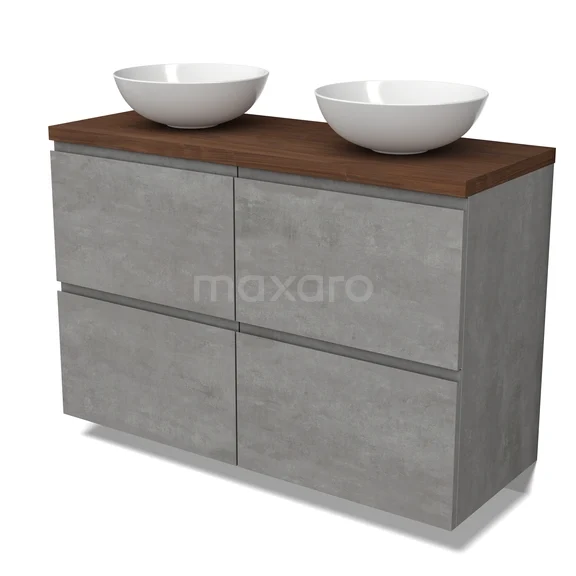 Modulo Plato Badmöbel mit Aufsatzwaschbecken | 120 cm Hellgrauer Beton Grifflos front Walnuss blatt 4 hohe Schubladen