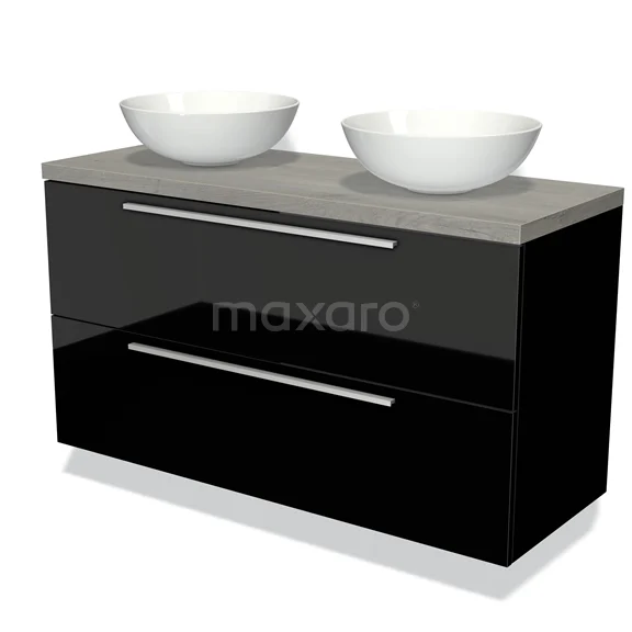 Modulo Plato Badmöbel mit Aufsatzwaschbecken | 120 cm Hochglanz Schwarz Flach front Graue Eiche blatt 2 übereinanderliegende Schubladen