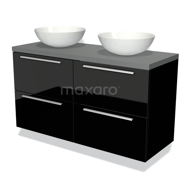 Modulo Plato Badmöbel mit Aufsatzwaschbecken | 120 cm Hochglanz Schwarz Flach front Mittelgrau blatt 4 Schubladen