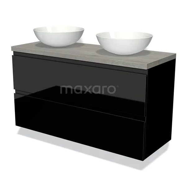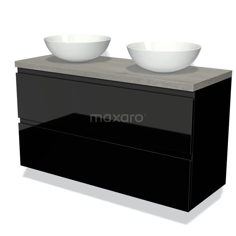 Modulo Plato Badmöbel mit Aufsatzwaschbecken | 120 cm Hochglanz Schwarz Grifflos front Graue Eiche blatt 2 übereinanderliegende Schubladen