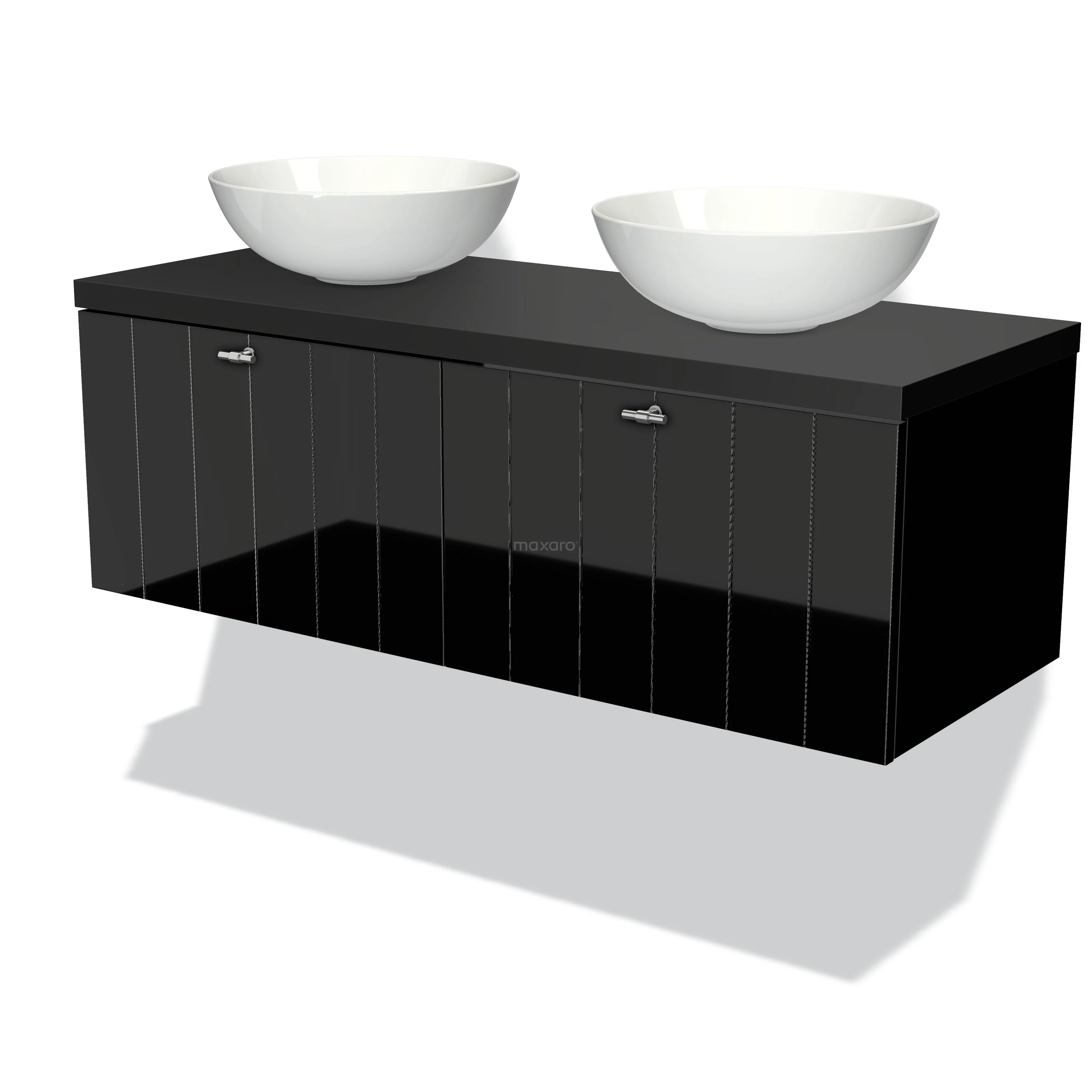 Modulo Plato Badmöbel mit Aufsatzwaschbecken | 120 cm Hochglanz Schwarz Lamelle front Matt Schwarz blatt 2 nebeneinanderliegende Schubladen