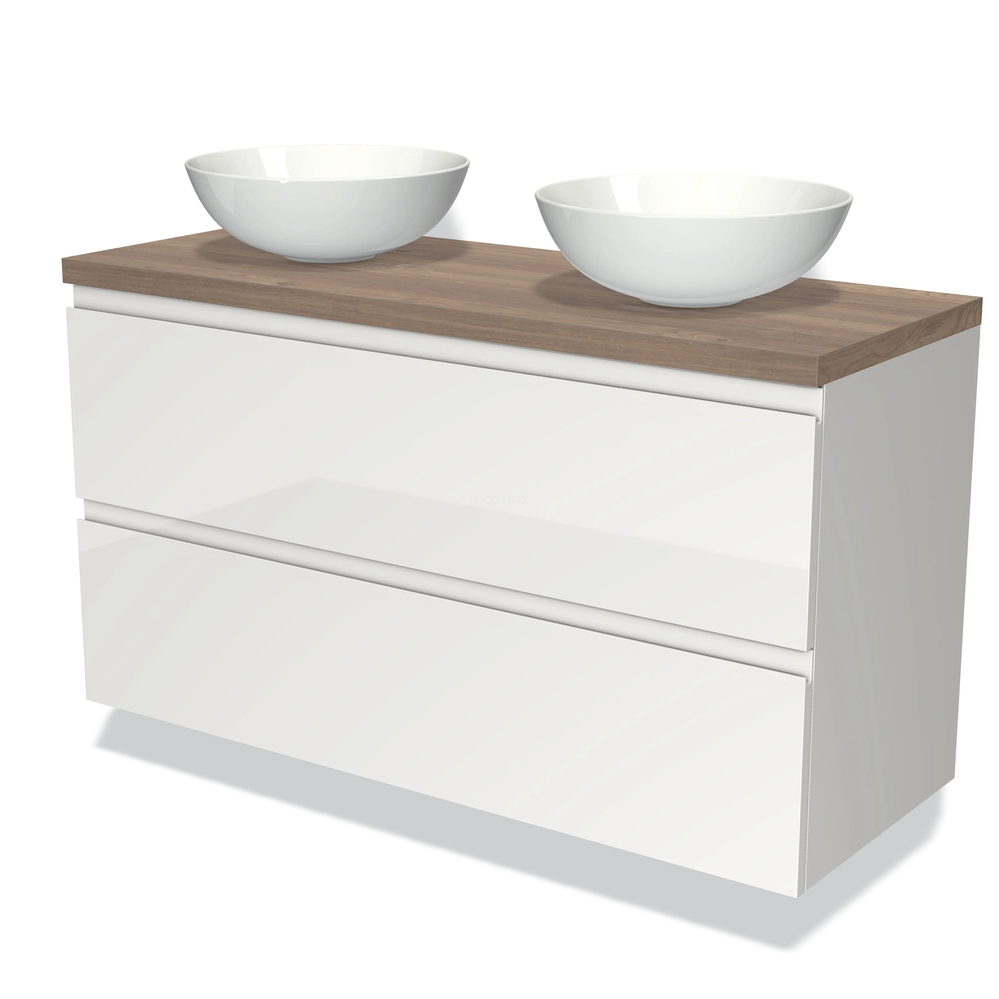 Modulo Plato Badmöbel mit Aufsatzwaschbecken | 120 cm Hochglanz Weiß Grifflos front Mittelbraune Eiche blatt 2 übereinanderliegende Schubladen