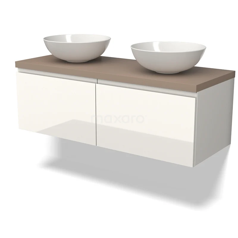 Modulo Plato Badmöbel mit Aufsatzwaschbecken | 120 cm Hochglanz Weiß Grifflos front Taupe blatt 2 nebeneinanderliegende Schubladen