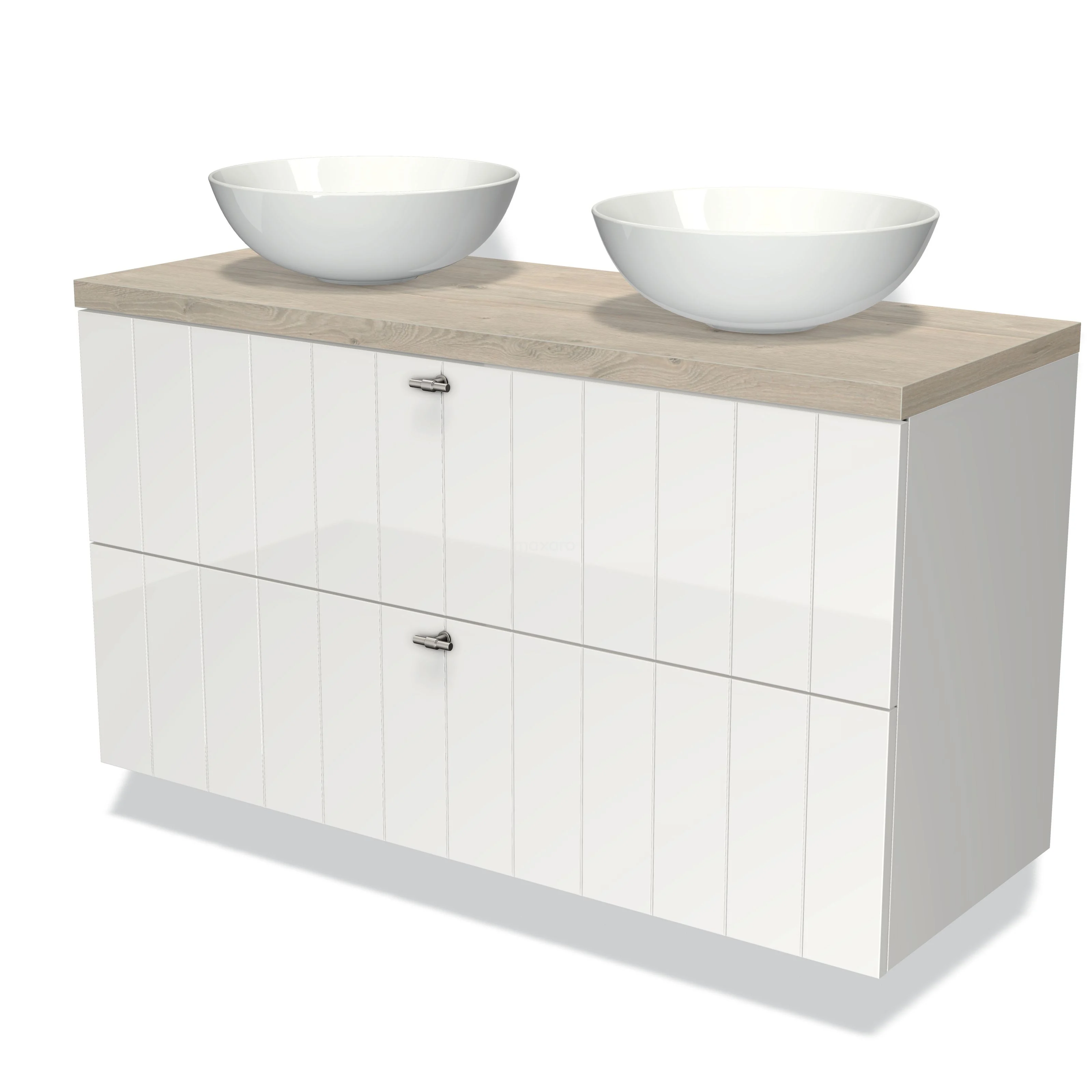 Modulo Plato Badmöbel mit Aufsatzwaschbecken | 120 cm Hochglanz Weiß Lamelle front Hellgraue Eiche blatt 2 übereinanderliegende Schubladen