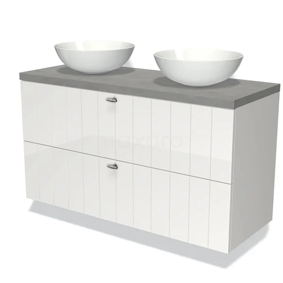 Modulo Plato Badmöbel mit Aufsatzwaschbecken | 120 cm Hochglanz Weiß Lamelle front Hellgrauer Beton blatt 2 übereinanderliegende Schubladen