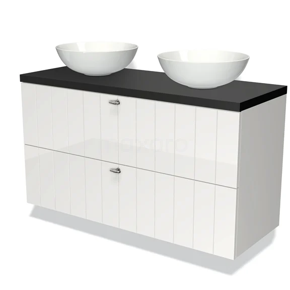 Modulo Plato Badmöbel mit Aufsatzwaschbecken | 120 cm Hochglanz Weiß Lamelle front Matt Schwarz blatt 2 übereinanderliegende Schubladen