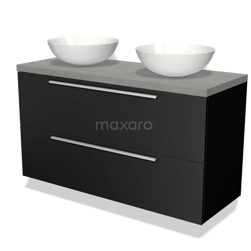 Modulo Plato Badmöbel mit Aufsatzwaschbecken | 120 cm Matt Schwarz Flach front Hellgrauer Beton blatt 2 übereinanderliegende Schubladen