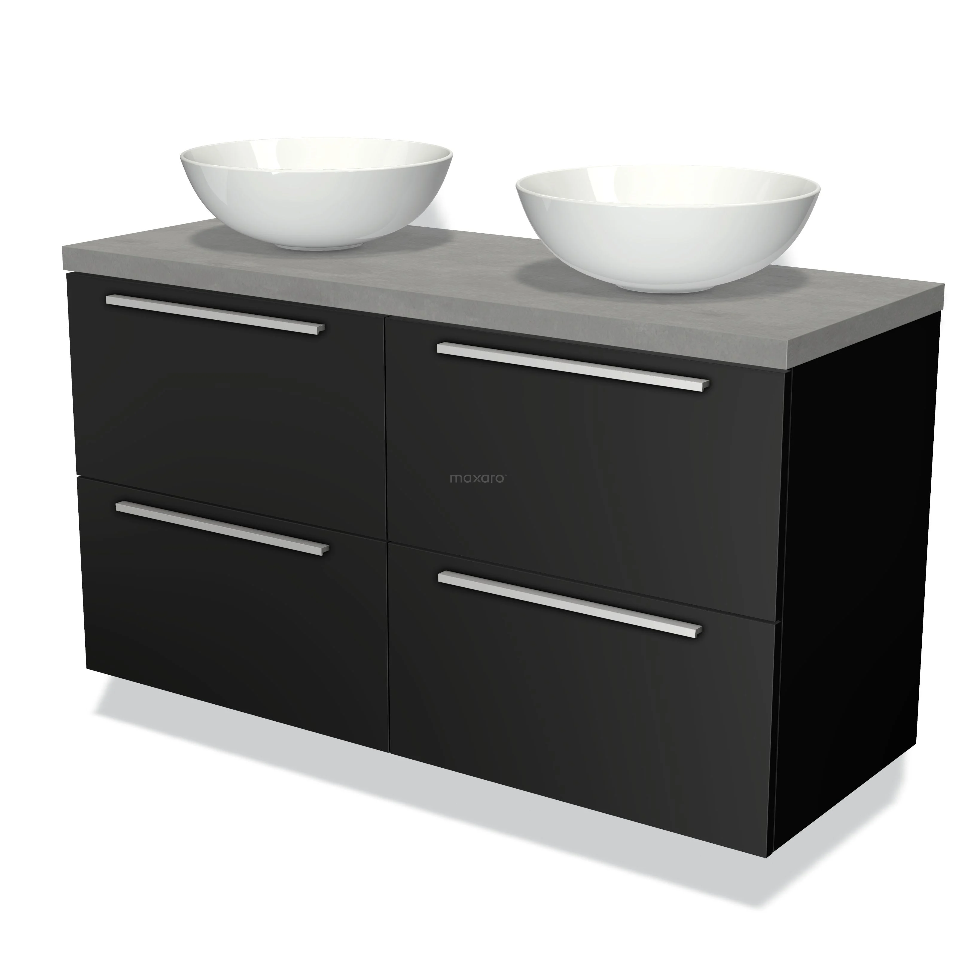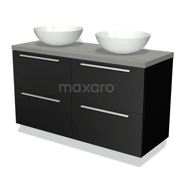 Modulo Plato Badmöbel mit Aufsatzwaschbecken | 120 cm Matt Schwarz Flach front Hellgrauer Beton blatt 4 Schubladen