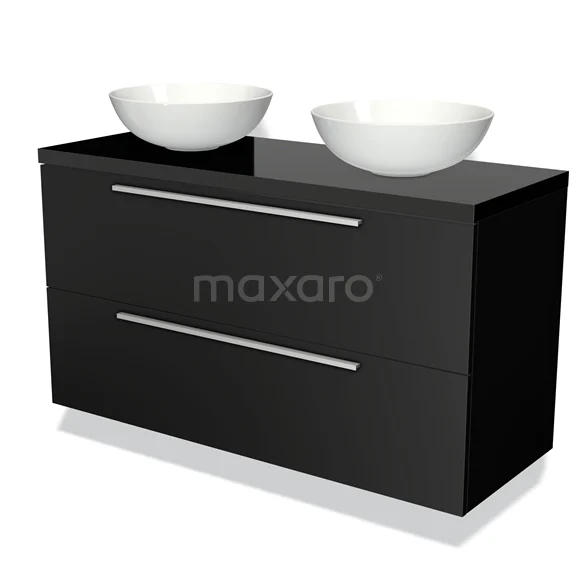 Modulo Plato Badmöbel mit Aufsatzwaschbecken | 120 cm Matt Schwarz Flach front Hochglanz Schwarz blatt 2 übereinanderliegende Schubladen