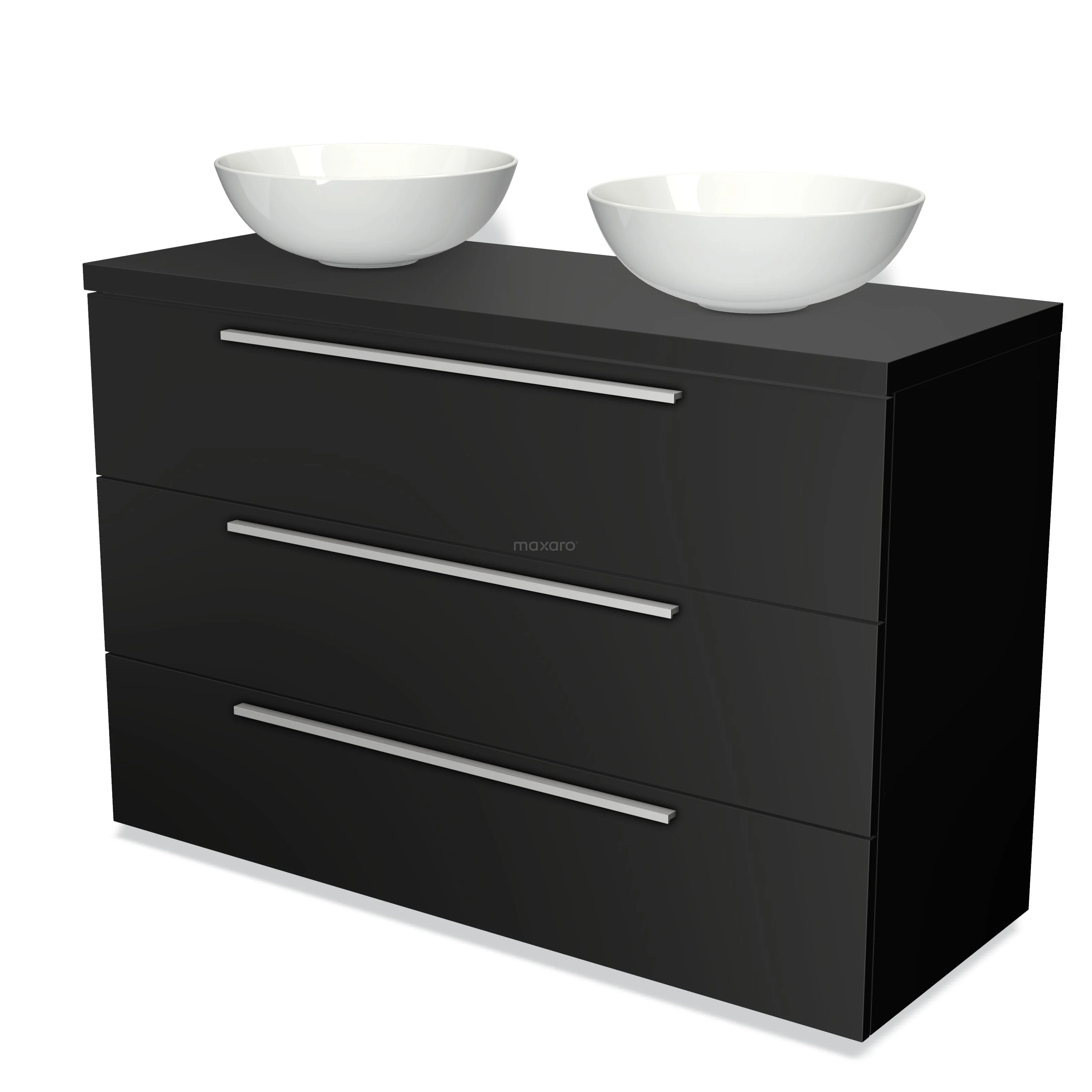 Modulo Plato Badmöbel mit Aufsatzwaschbecken | 120 cm Matt Schwarz Flach front Matt Schwarz blatt 3 Schubladen