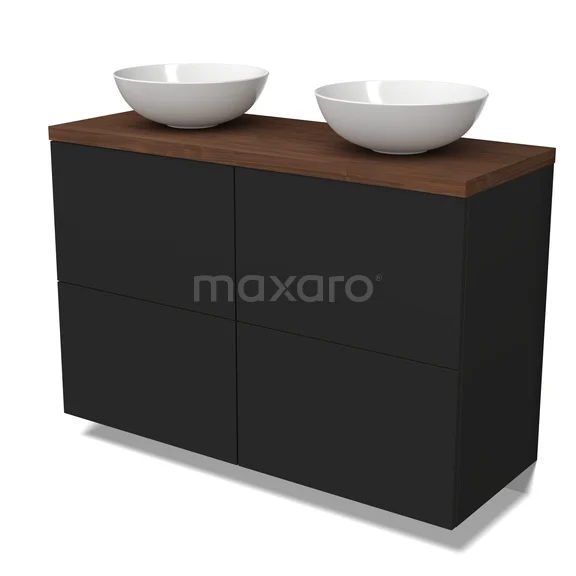 Modulo Plato Badmöbel mit Aufsatzwaschbecken | 120 cm Matt Schwarz Flach front Walnuss blatt 4 hohe Schubladen