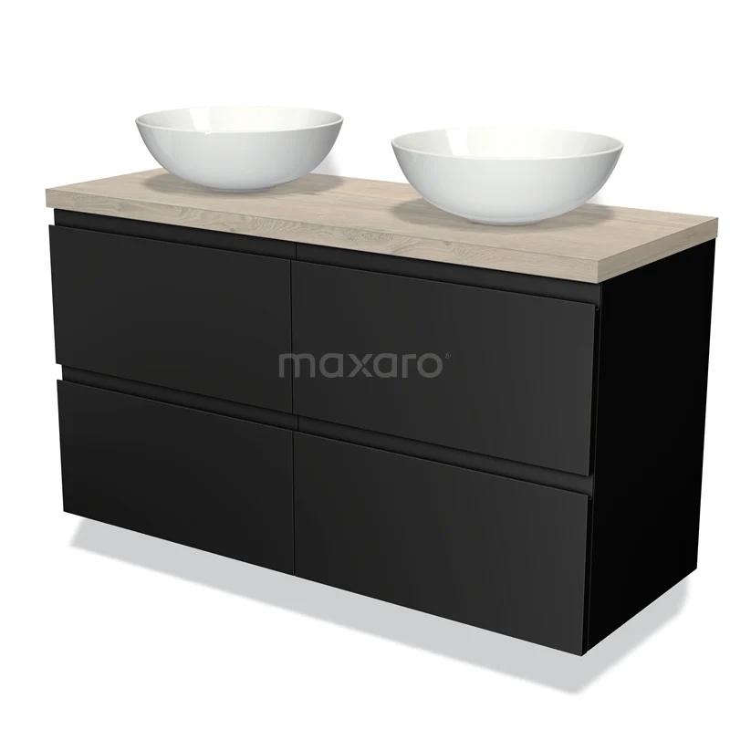 Modulo Plato Badmöbel mit Aufsatzwaschbecken | 120 cm Matt Schwarz Grifflos front Hellgraue Eiche blatt 4 Schubladen
