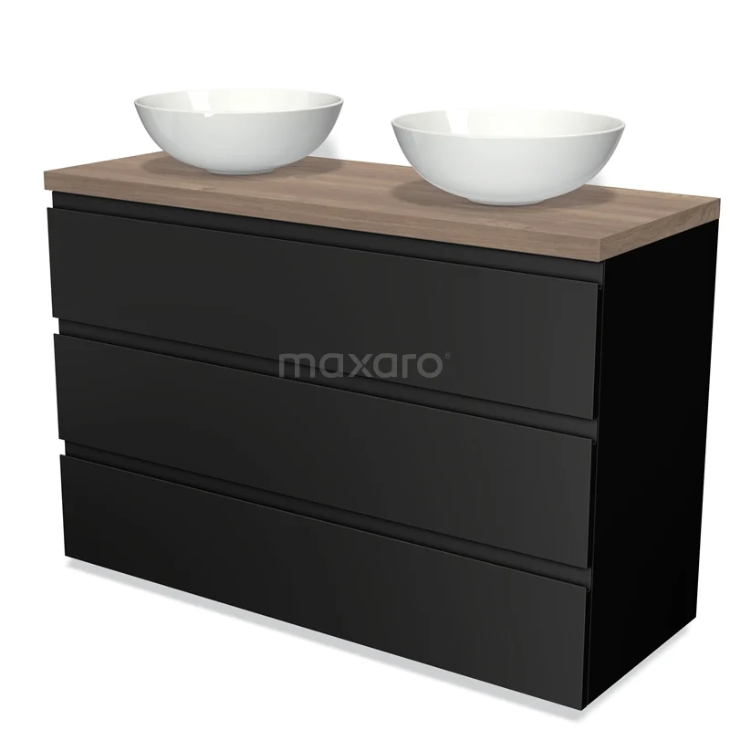 Modulo Plato Badmöbel mit Aufsatzwaschbecken | 120 cm Matt Schwarz Grifflos front Mittelbraune Eiche blatt 3 Schubladen
