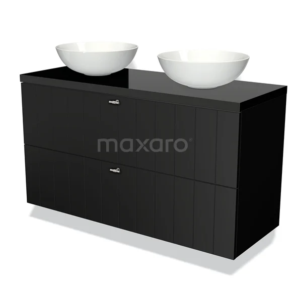 Modulo Plato Badmöbel mit Aufsatzwaschbecken | 120 cm Matt Schwarz Lamelle front Hochglanz Schwarz blatt 2 übereinanderliegende Schubladen