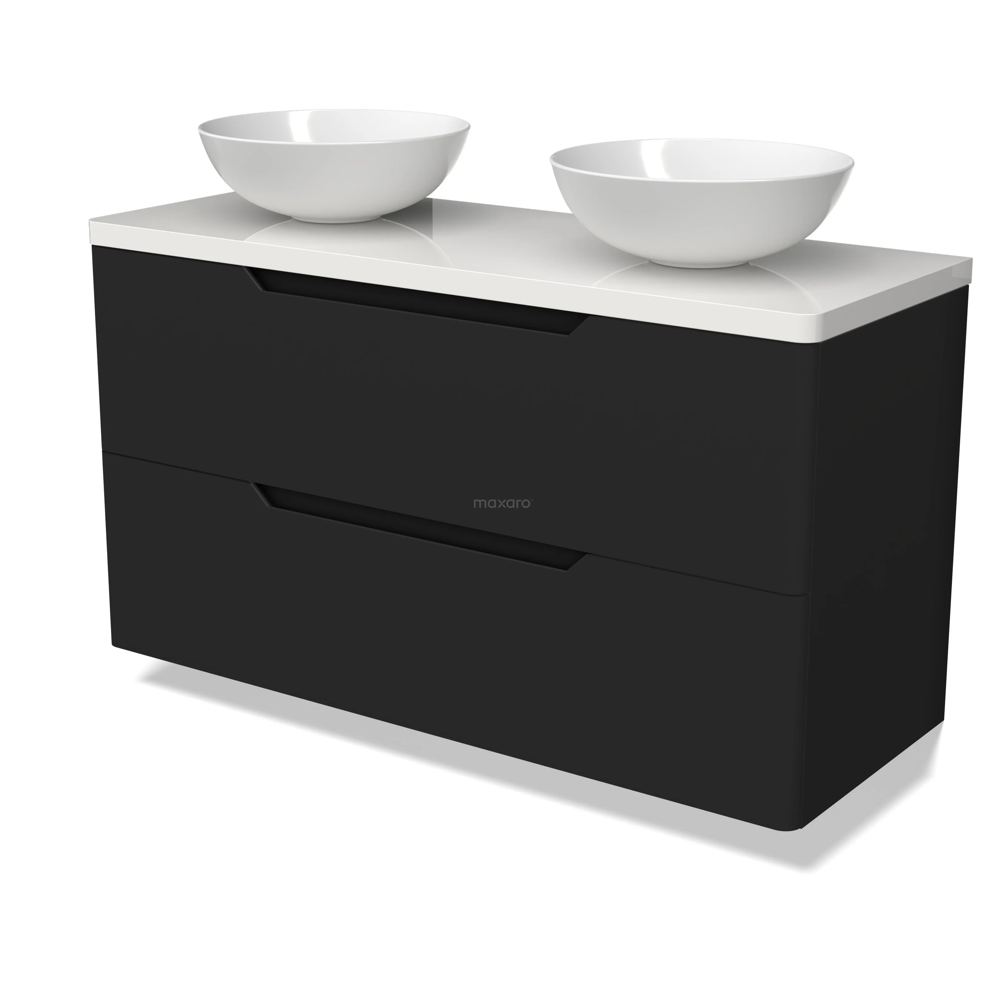 Modulo Plato Badmöbel mit Aufsatzwaschbecken | 120 cm Matt Schwarz Rund front Hochglanz Weiß blatt 2 übereinanderliegende Schubladen