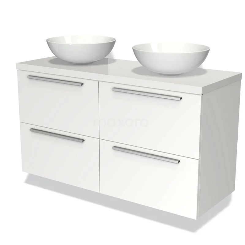 Modulo Plato Badmöbel mit Aufsatzwaschbecken | 120 cm Matt Weiß Flach front Hochglanz Weiß blatt 4 Schubladen