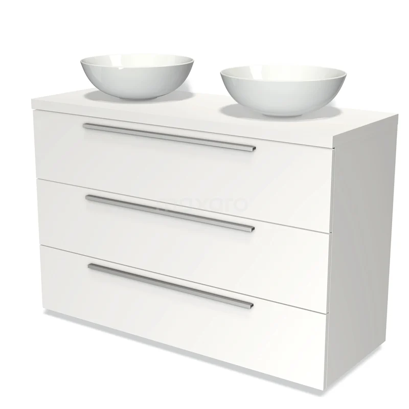 Modulo Plato Badmöbel mit Aufsatzwaschbecken | 120 cm Matt Weiß Flach front Matt Weiß blatt 3 Schubladen