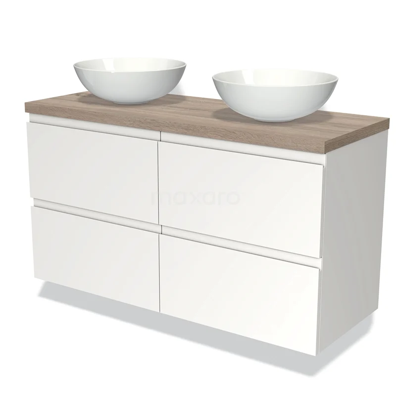 Modulo Plato Badmöbel mit Aufsatzwaschbecken | 120 cm Matt Weiß Grifflos front Eiche blatt 4 Schubladen