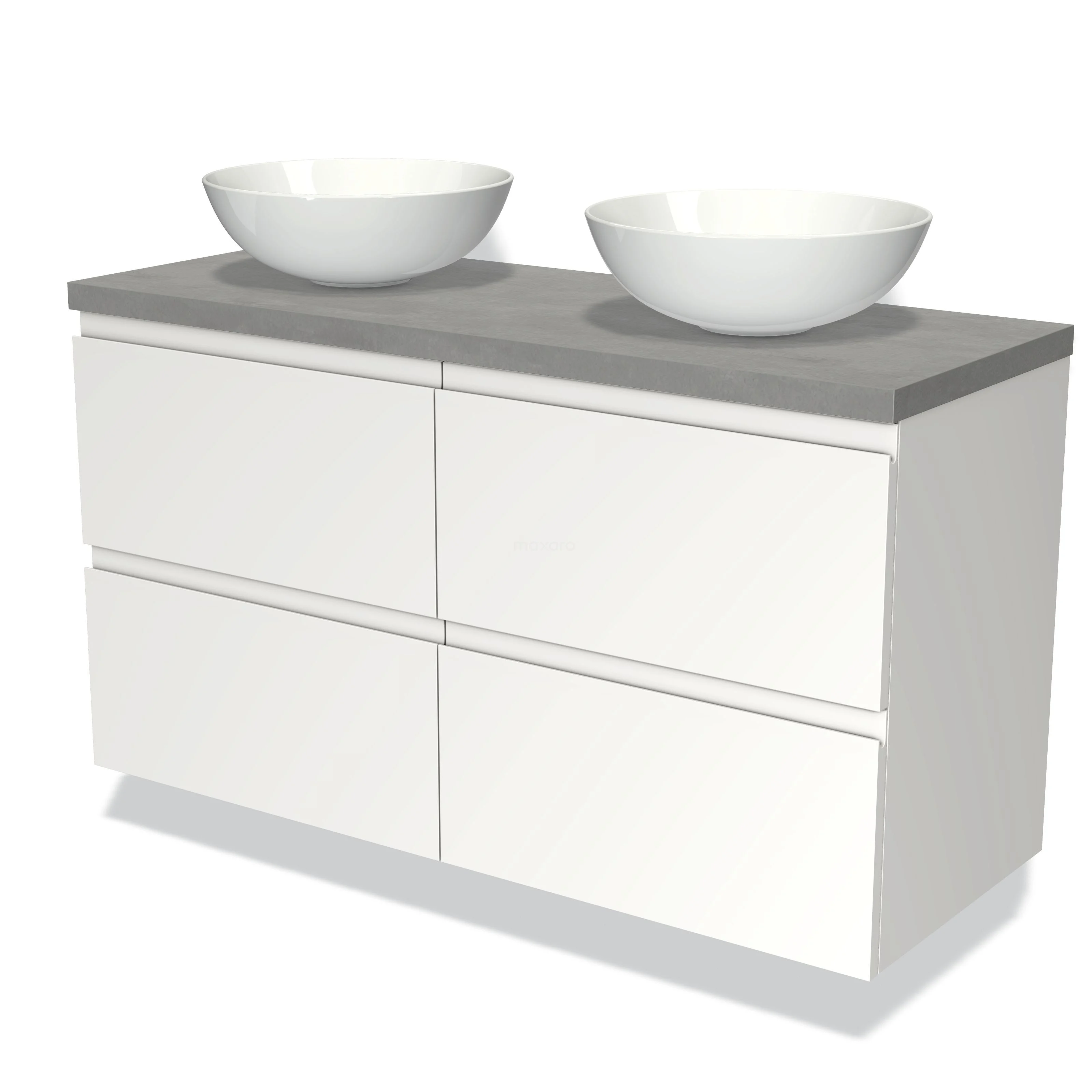 Modulo Plato Badmöbel mit Aufsatzwaschbecken | 120 cm Matt Weiß Grifflos front Hellgrauer Beton blatt 4 Schubladen