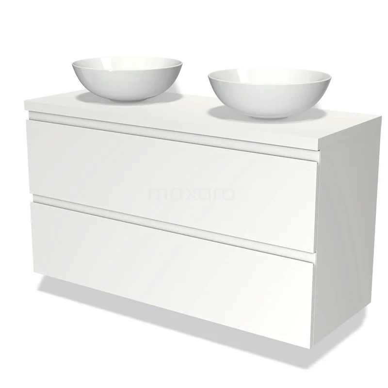 Modulo Plato Badmöbel mit Aufsatzwaschbecken | 120 cm Matt Weiß Grifflos front Matt Weiß blatt 2 übereinanderliegende Schubladen
