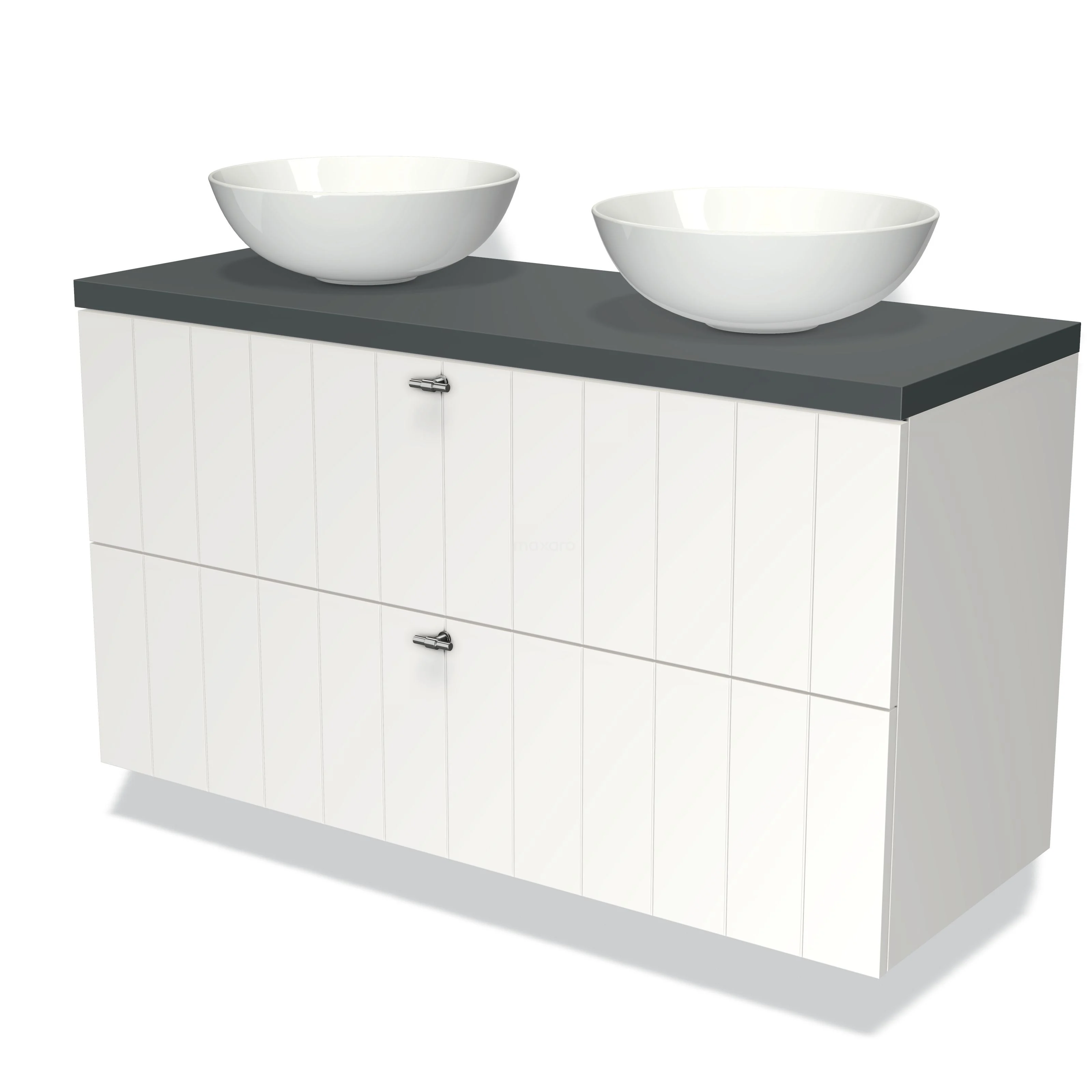 Modulo Plato Badmöbel mit Aufsatzwaschbecken | 120 cm Matt Weiß Lamelle front Dunkelgrau blatt 2 übereinanderliegende Schubladen