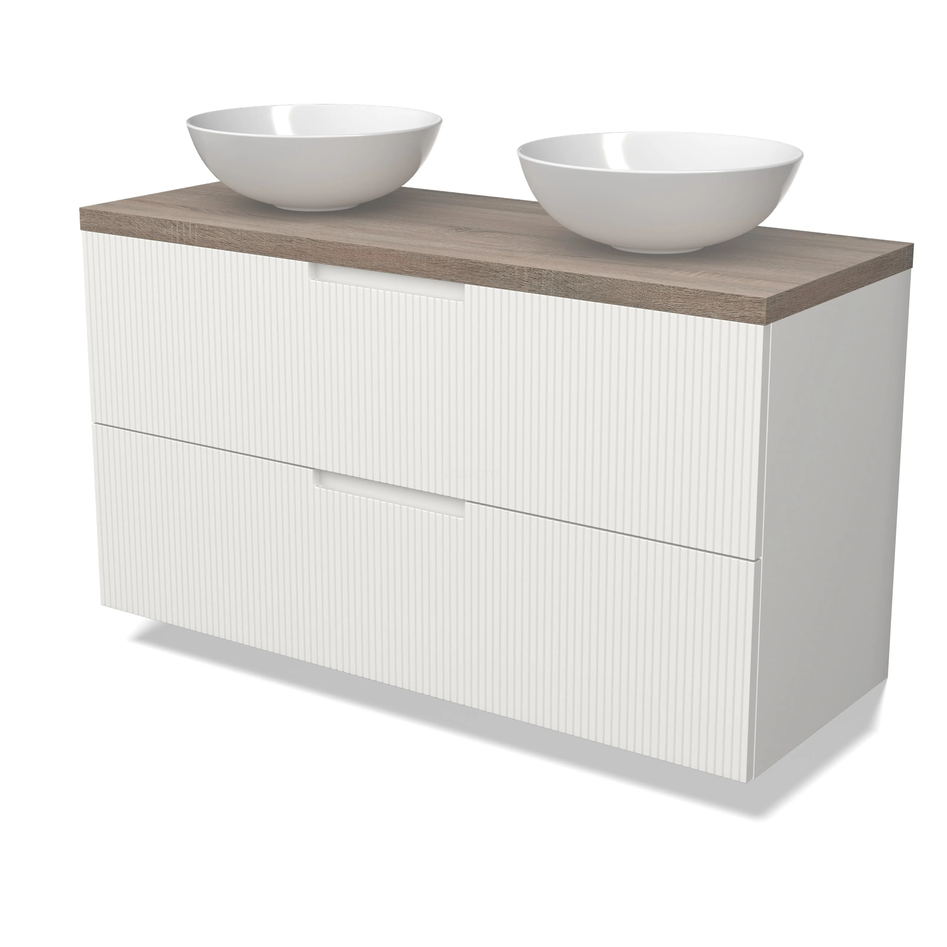 Modulo Plato Badmöbel mit Aufsatzwaschbecken | 120 cm Matt Weiß Linie front Eiche blatt 2 übereinanderliegende Schubladen
