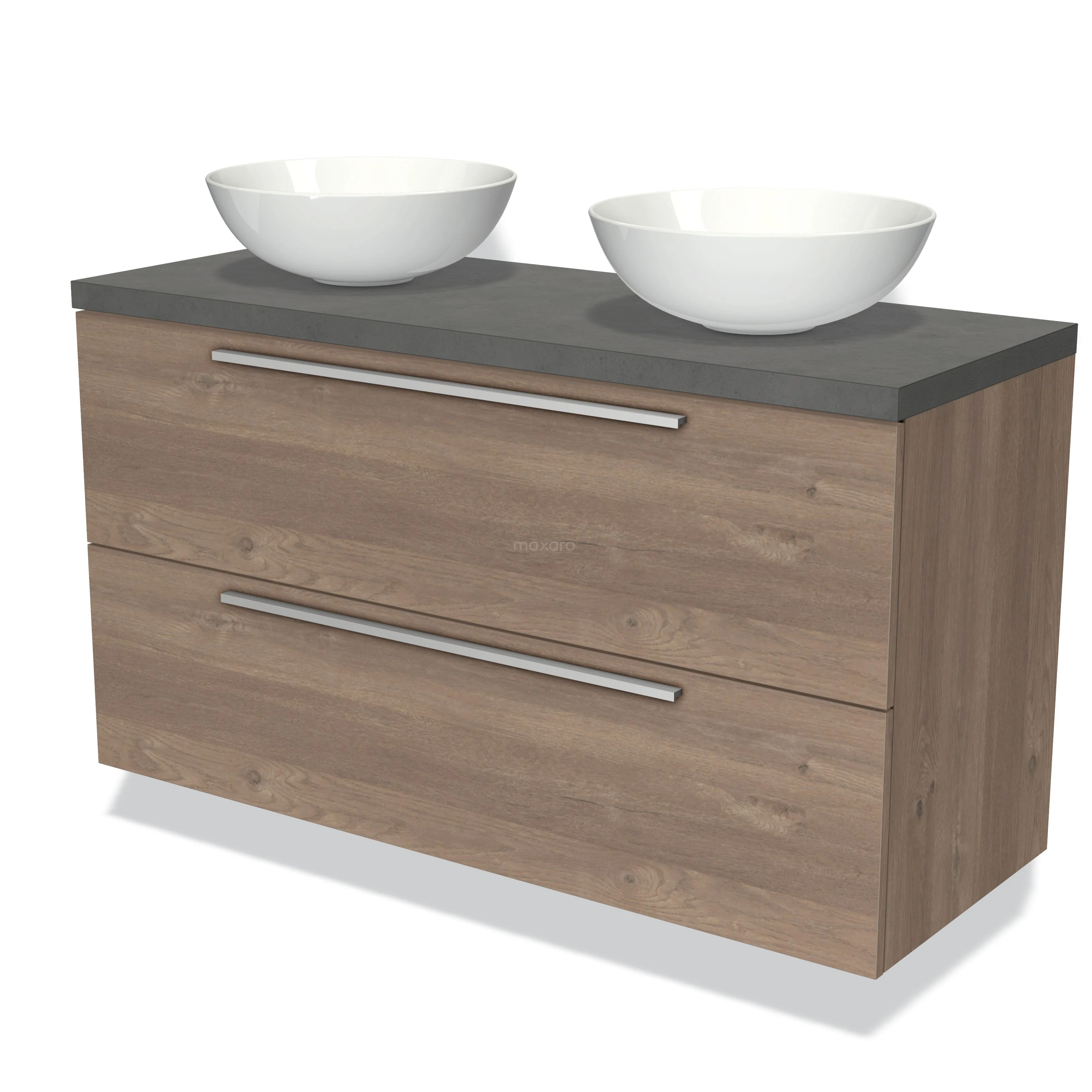 Modulo Plato Badmöbel mit Aufsatzwaschbecken | 120 cm Mittelbraune Eiche Flach front Dunkelgrauer Beton blatt 2 übereinanderliegende Schubladen