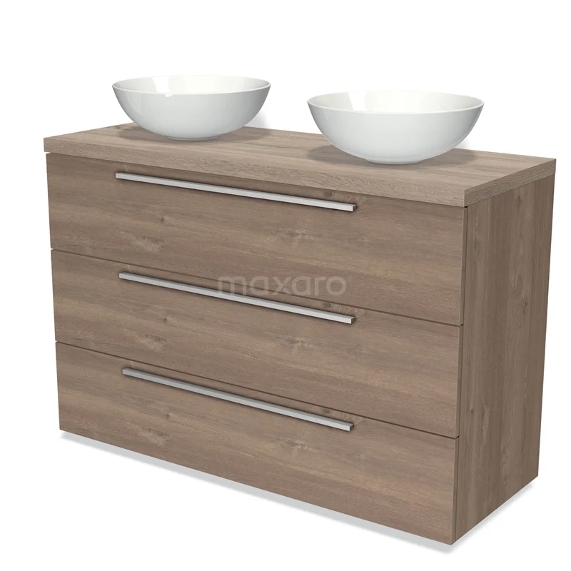 Modulo Plato Badmöbel mit Aufsatzwaschbecken | 120 cm Mittelbraune Eiche Flach front Eiche blatt 3 Schubladen