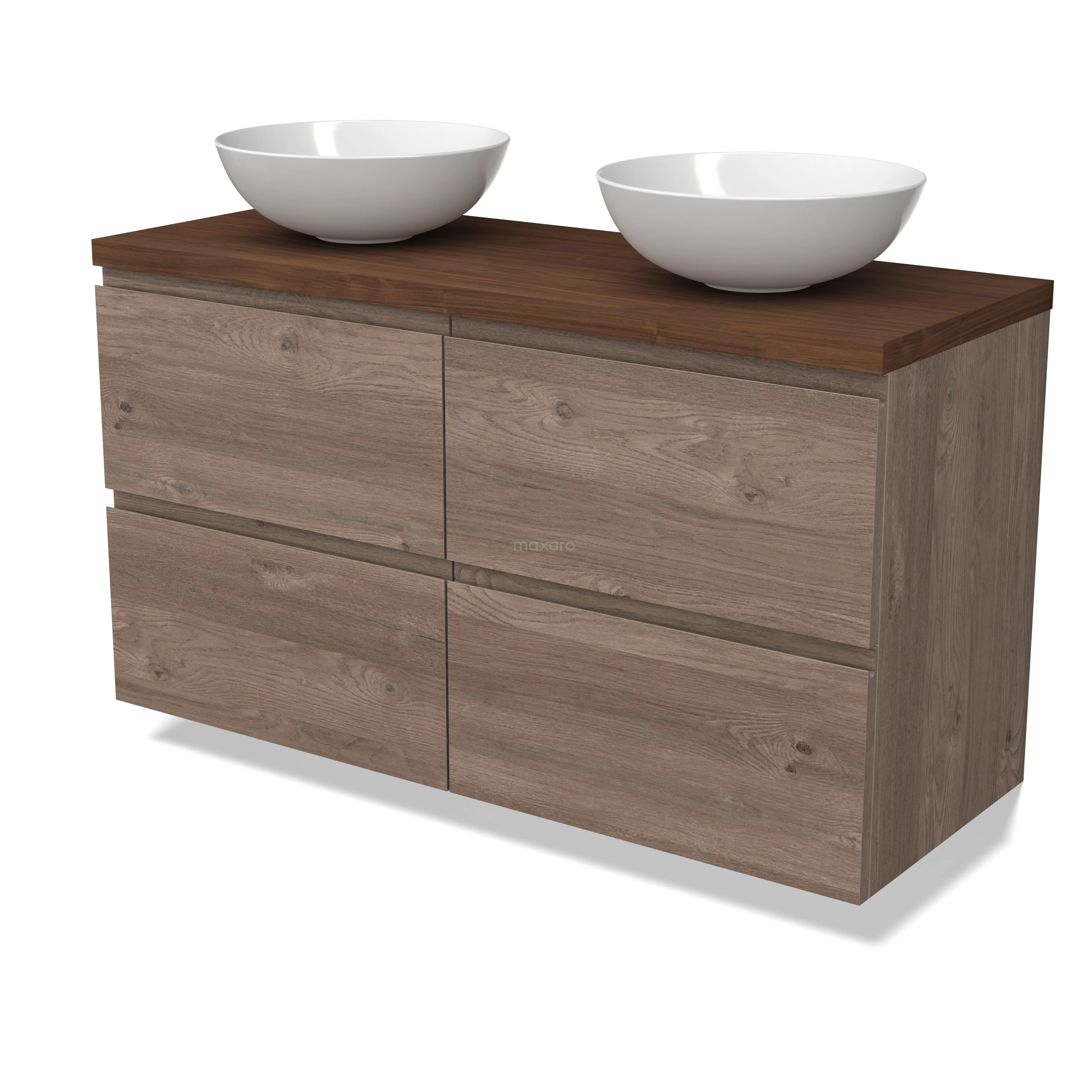 Modulo Plato Badmöbel mit Aufsatzwaschbecken | 120 cm Mittelbraune Eiche Grifflos front Walnuss blatt 4 Schubladen