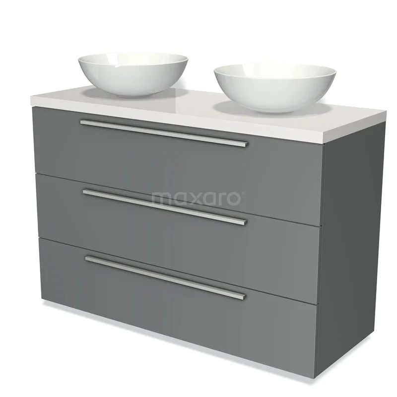 Modulo Plato Badmöbel mit Aufsatzwaschbecken | 120 cm Mittelgrau Flach front Hochglanz Weiß blatt 3 Schubladen