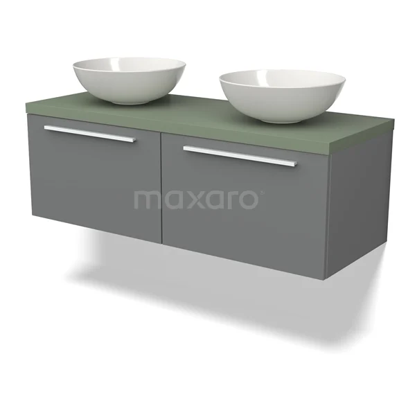 Modulo Plato Badmöbel mit Aufsatzwaschbecken | 120 cm Mittelgrau Flach front Salbeigrün blatt 2 nebeneinanderliegende Schubladen