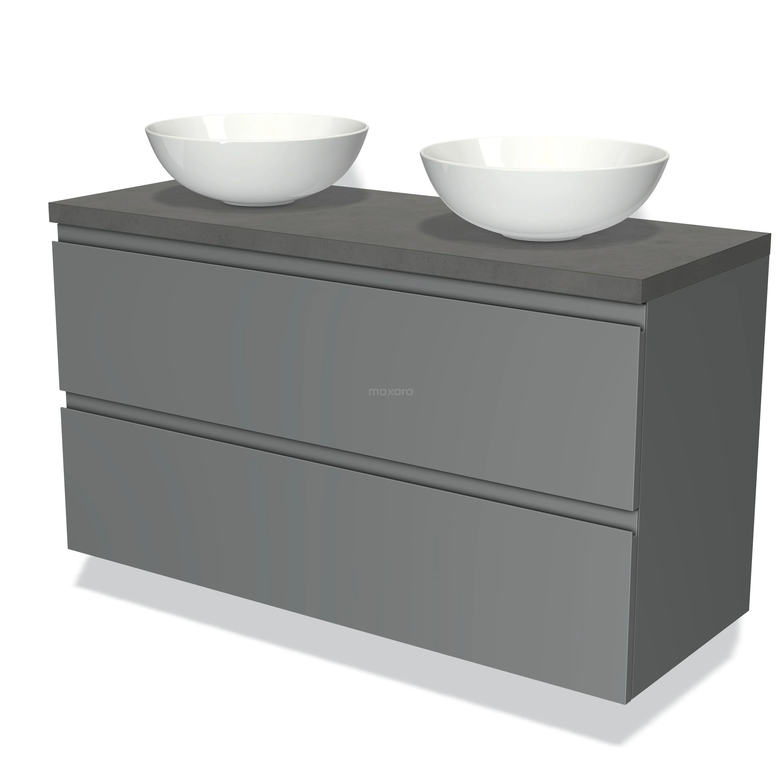Modulo Plato Badmöbel mit Aufsatzwaschbecken | 120 cm Mittelgrau Grifflos front Dunkelgrauer Beton blatt 2 übereinanderliegende Schubladen