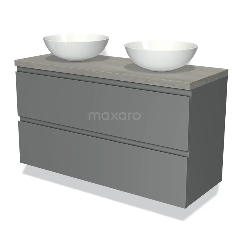 Modulo Plato Badmöbel mit Aufsatzwaschbecken | 120 cm Mittelgrau Grifflos front Graue Eiche blatt 2 übereinanderliegende Schubladen