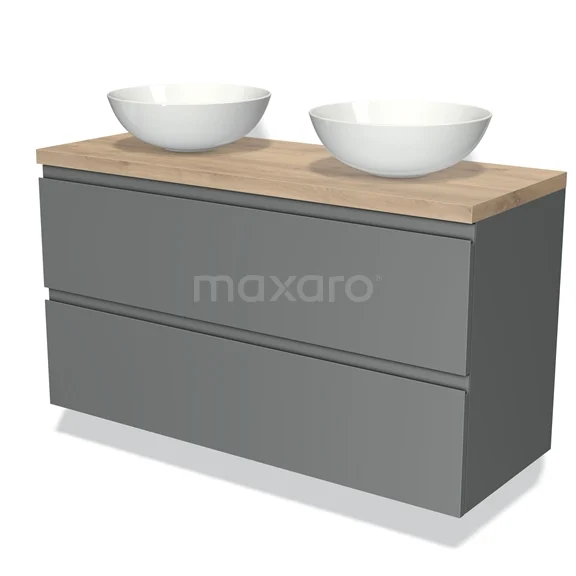 Modulo Plato Badmöbel mit Aufsatzwaschbecken | 120 cm Mittelgrau Grifflos front Hellbraune Eiche blatt 2 übereinanderliegende Schubladen