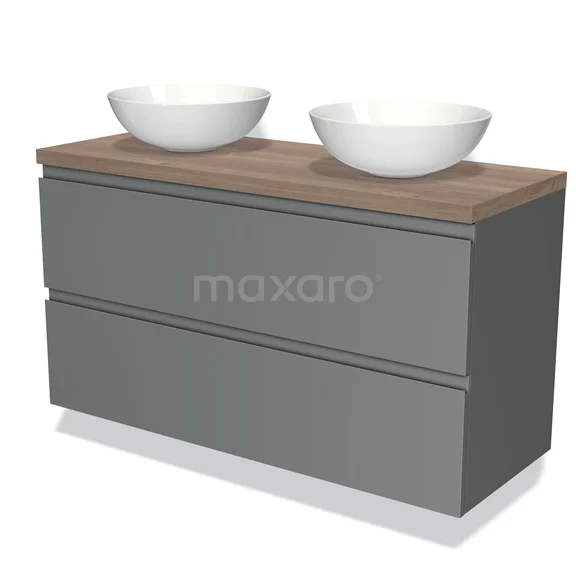 Modulo Plato Badmöbel mit Aufsatzwaschbecken | 120 cm Mittelgrau Grifflos front Mittelbraune Eiche blatt 2 übereinanderliegende Schubladen