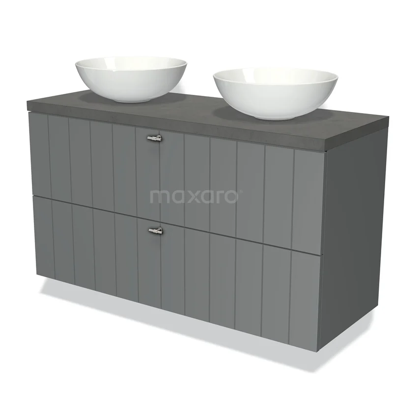 Modulo Plato Badmöbel mit Aufsatzwaschbecken | 120 cm Mittelgrau Lamelle front Dunkelgrauer Beton blatt 2 übereinanderliegende Schubladen