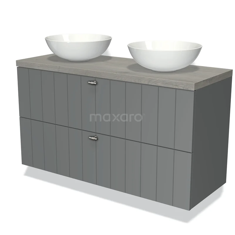 Modulo Plato Badmöbel mit Aufsatzwaschbecken | 120 cm Mittelgrau Lamelle front Graue Eiche blatt 2 übereinanderliegende Schubladen