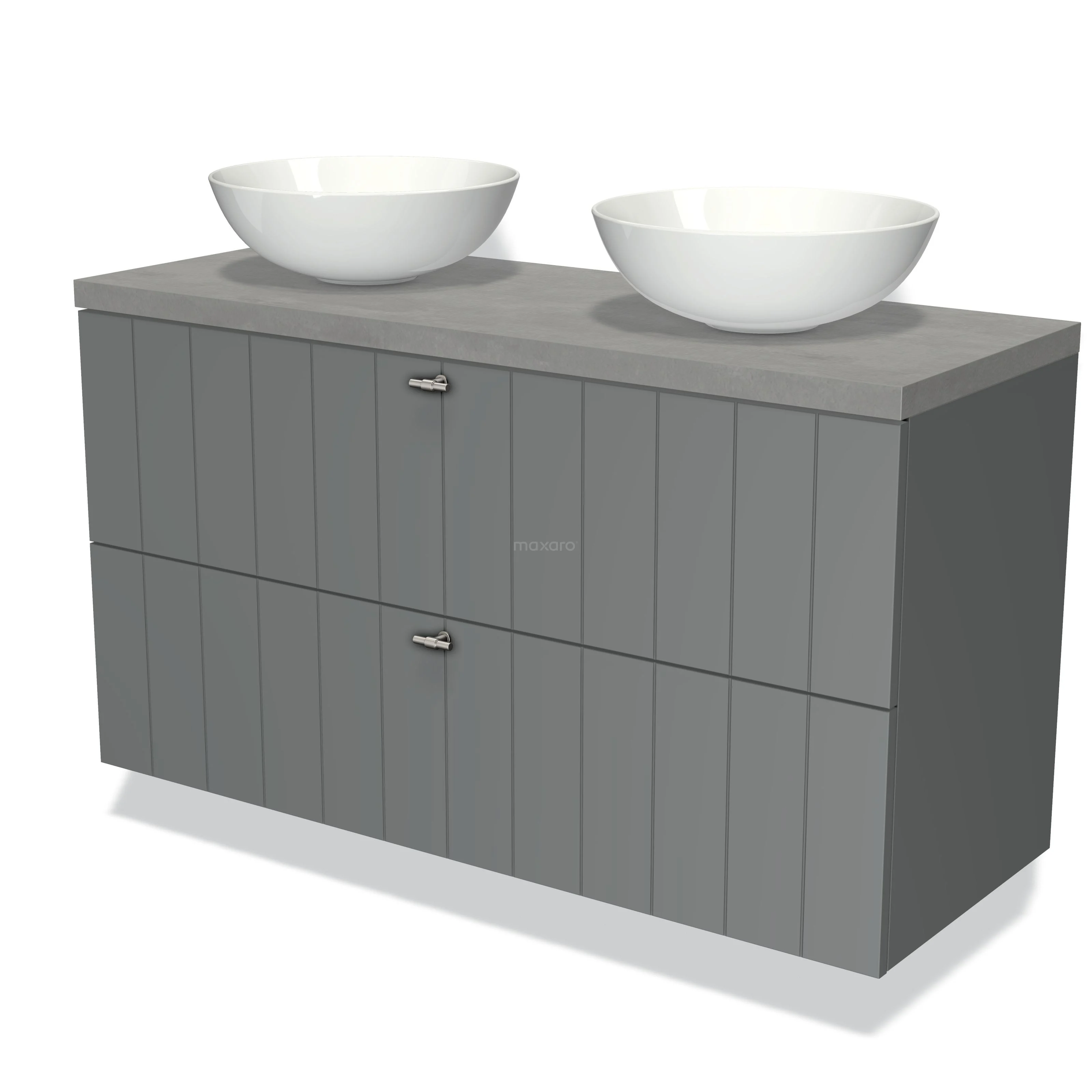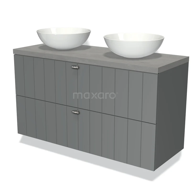 Modulo Plato Badmöbel mit Aufsatzwaschbecken | 120 cm Mittelgrau Lamelle front Hellgrauer Beton blatt 2 übereinanderliegende Schubladen