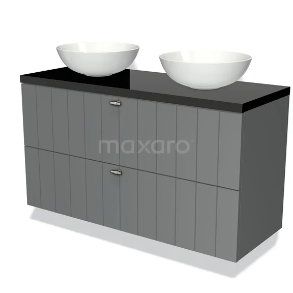 Modulo Plato Badmöbel mit Aufsatzwaschbecken | 120 cm Mittelgrau Lamelle front Hochglanz Schwarz blatt 2 übereinanderliegende Schubladen