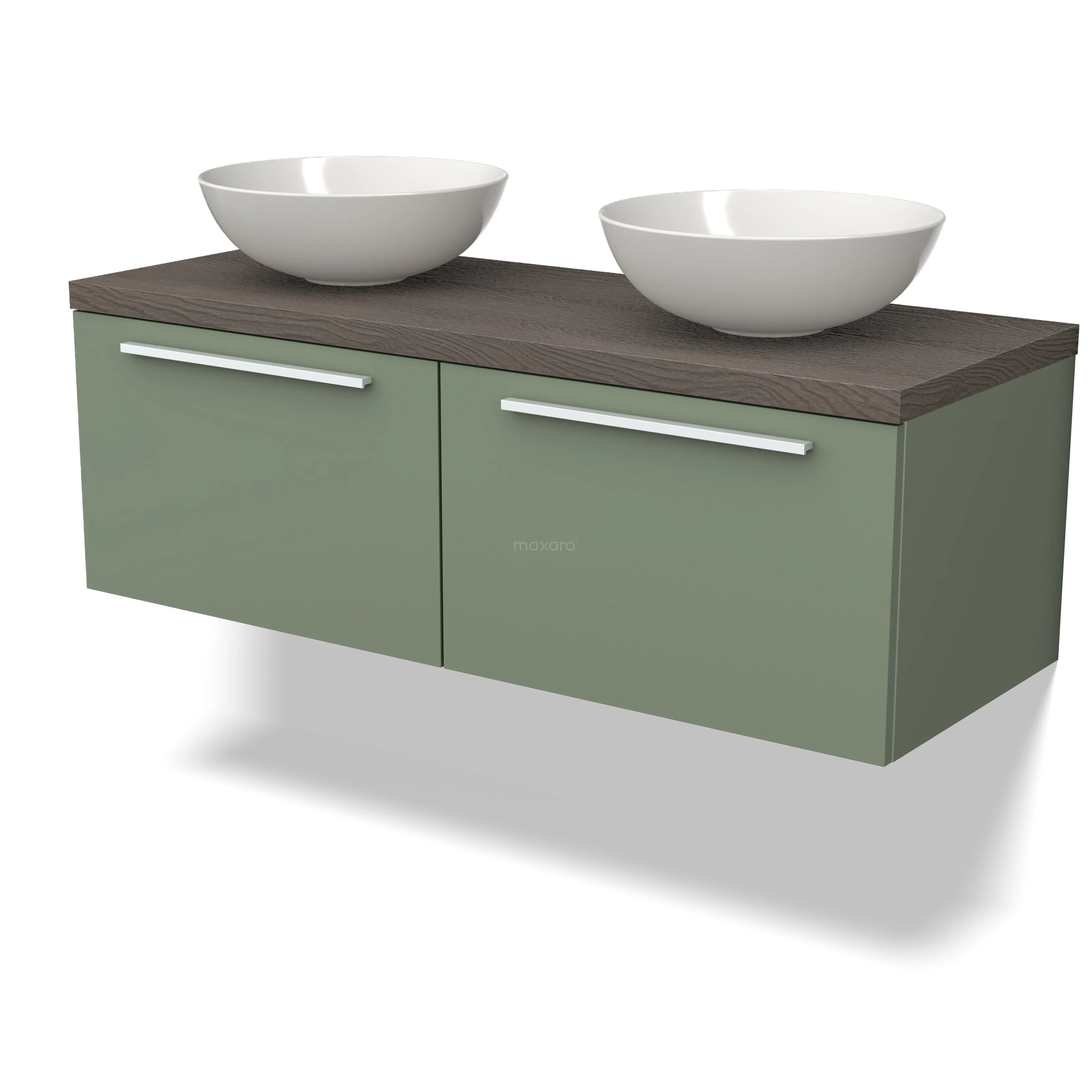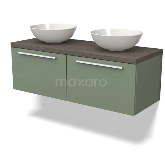 Modulo Plato Badmöbel mit Aufsatzwaschbecken | 120 cm Salbeigrün Flach front Dunkelbraune Eiche blatt 2 nebeneinanderliegende Schubladen