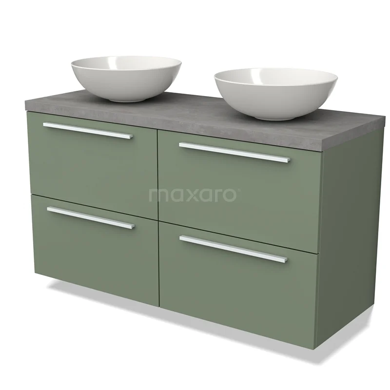 Modulo Plato Badmöbel mit Aufsatzwaschbecken | 120 cm Salbeigrün Flach front Hellgrauer Beton blatt 4 Schubladen