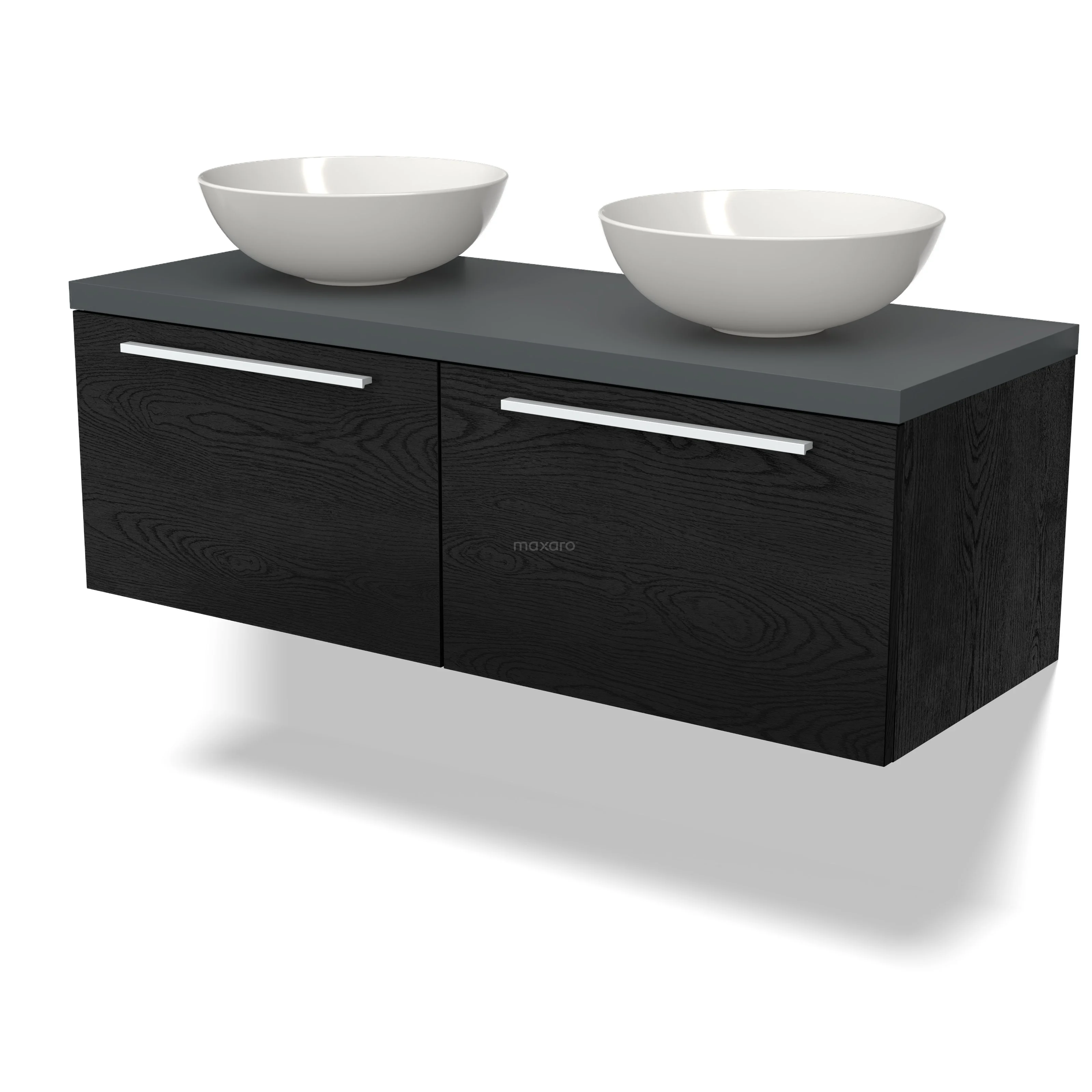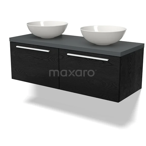 Modulo Plato Badmöbel mit Aufsatzwaschbecken | 120 cm Schwarze Eiche Flach front Dunkelgrau blatt 2 nebeneinanderliegende Schubladen