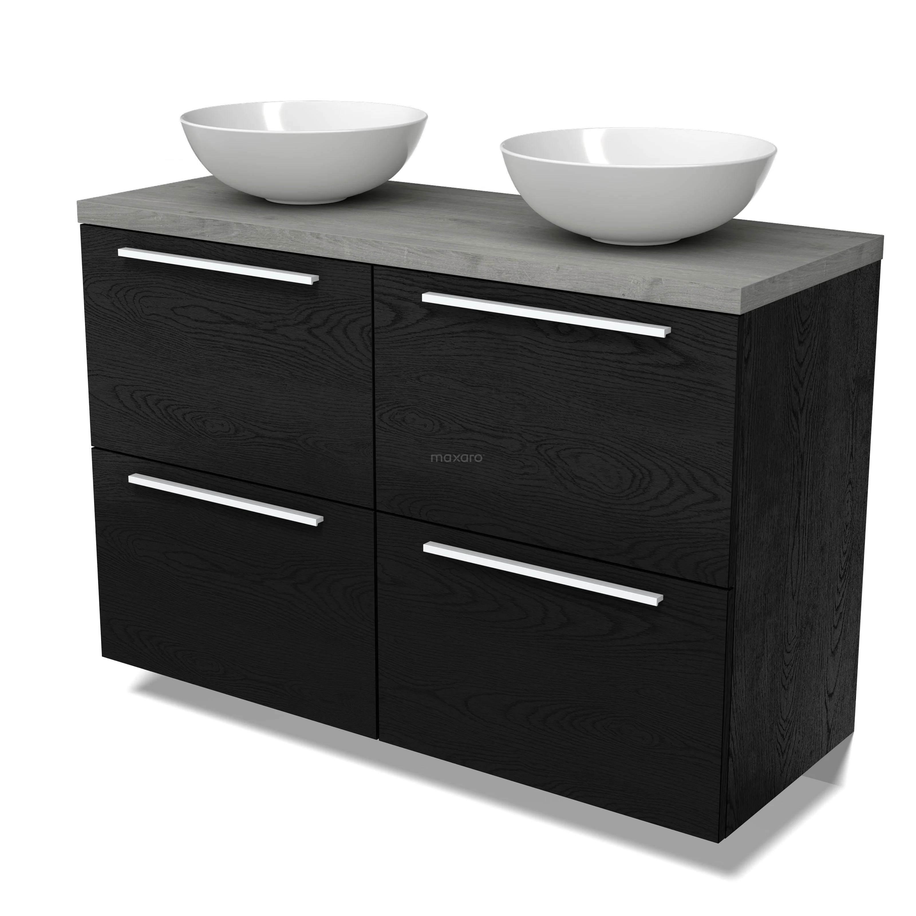Modulo Plato Badmöbel mit Aufsatzwaschbecken | 120 cm Schwarze Eiche Flach front Graue Eiche blatt 4 hohe Schubladen