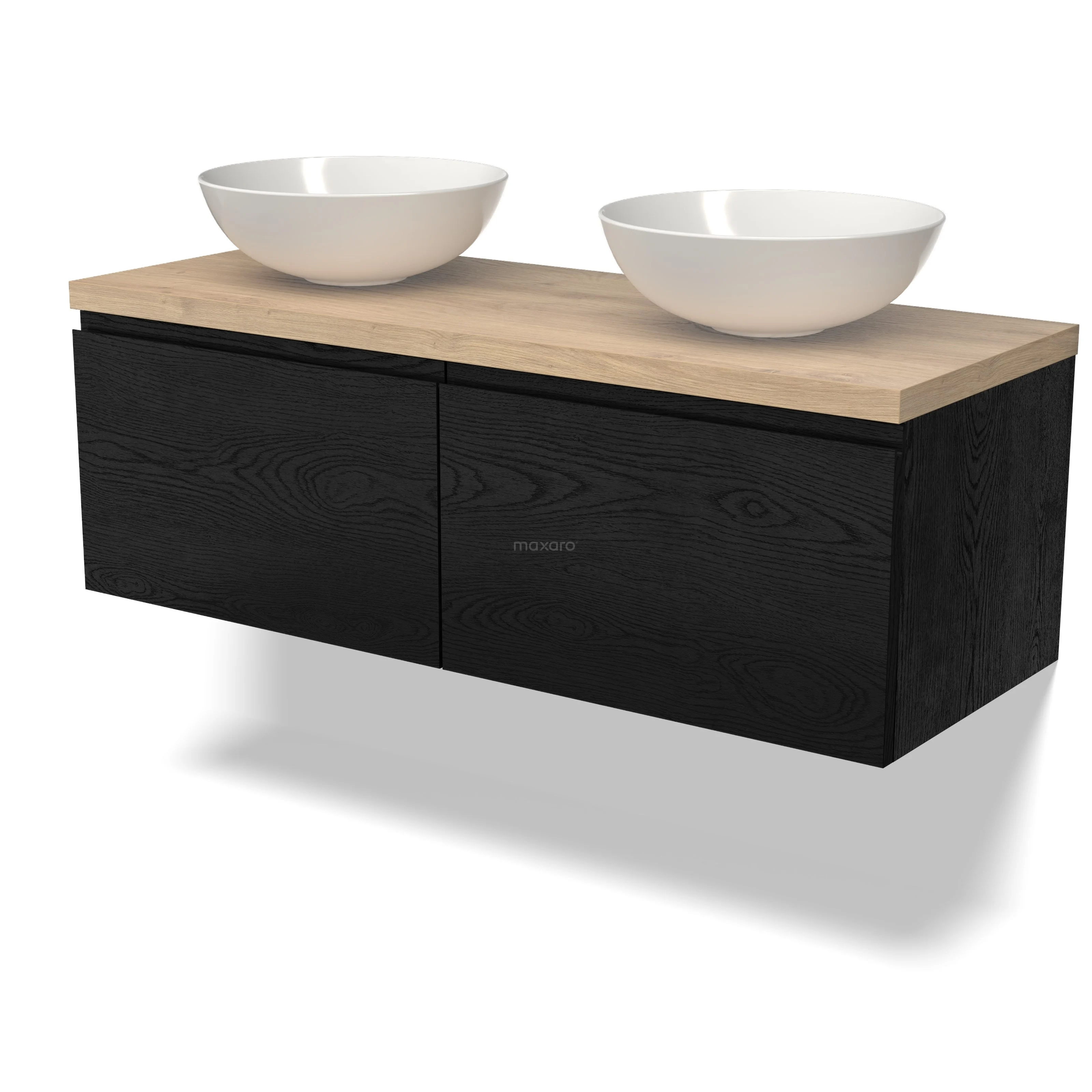 Modulo Plato Badmöbel mit Aufsatzwaschbecken | 120 cm Schwarze Eiche Grifflos front Hellbraune Eiche blatt 2 nebeneinanderliegende Schubladen