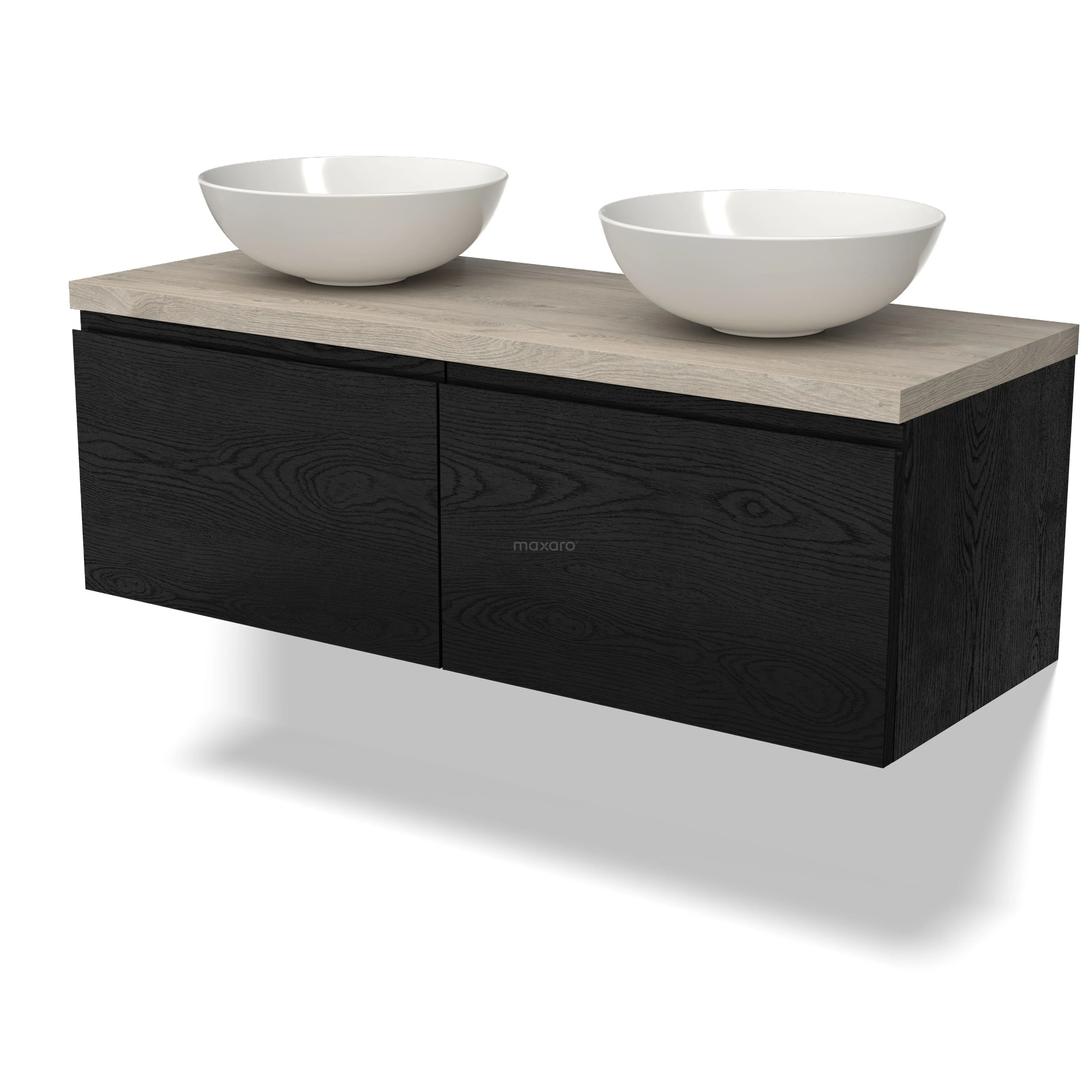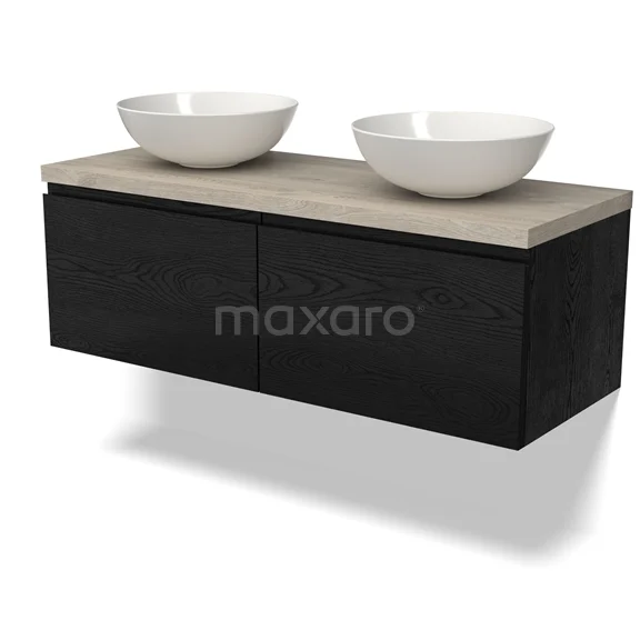 Modulo Plato Badmöbel mit Aufsatzwaschbecken | 120 cm Schwarze Eiche Grifflos front Hellgraue Eiche blatt 2 nebeneinanderliegende Schubladen