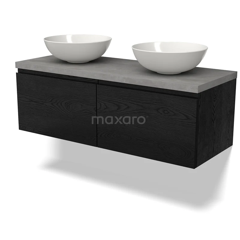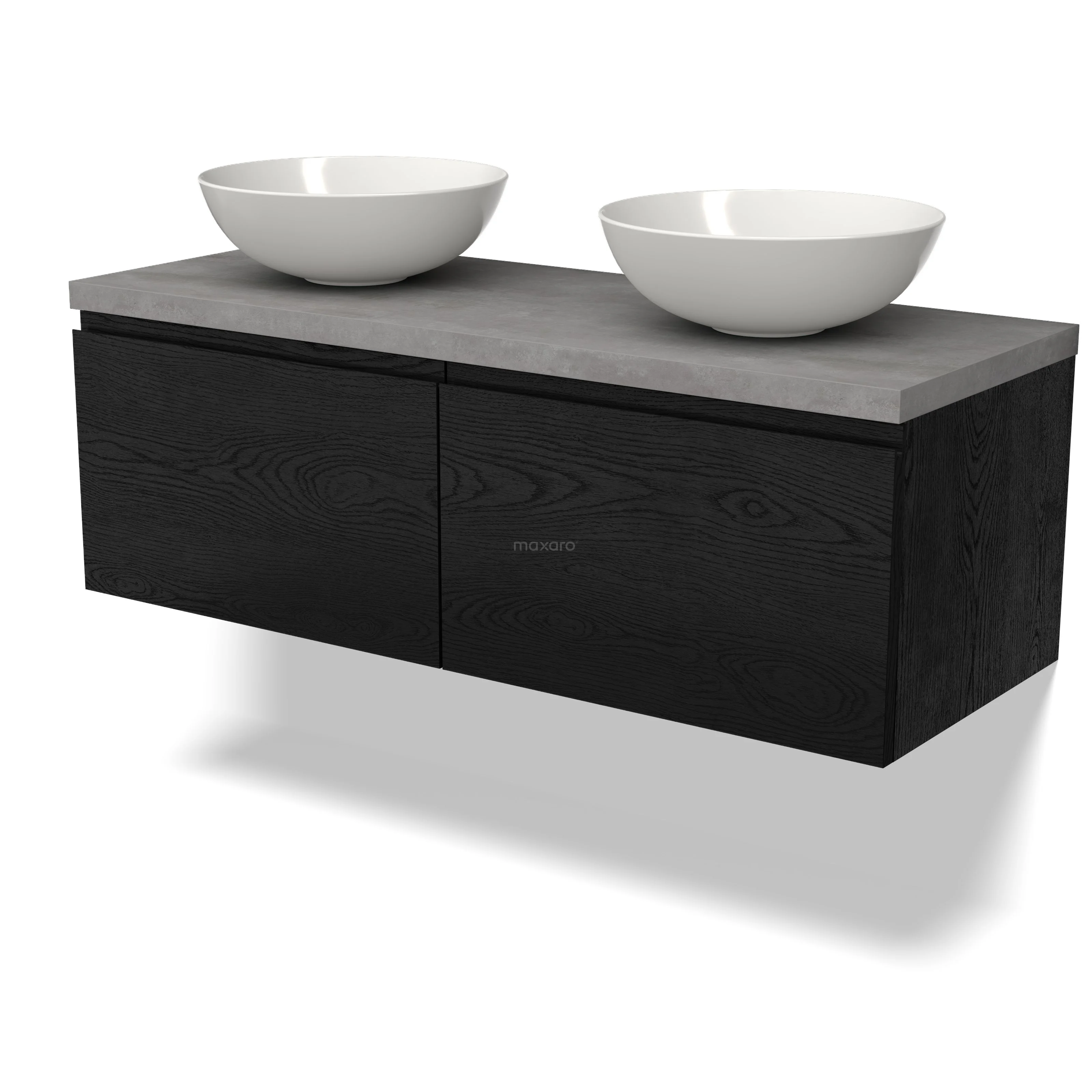 Modulo Plato Badmöbel mit Aufsatzwaschbecken | 120 cm Schwarze Eiche Grifflos front Hellgrauer Beton blatt 2 nebeneinanderliegende Schubladen