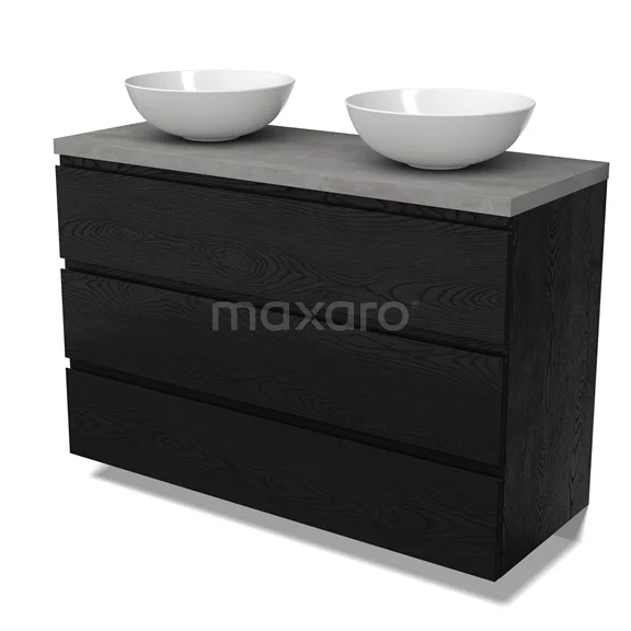 Modulo Plato Badmöbel mit Aufsatzwaschbecken | 120 cm Schwarze Eiche Grifflos front Hellgrauer Beton blatt 3 Schubladen