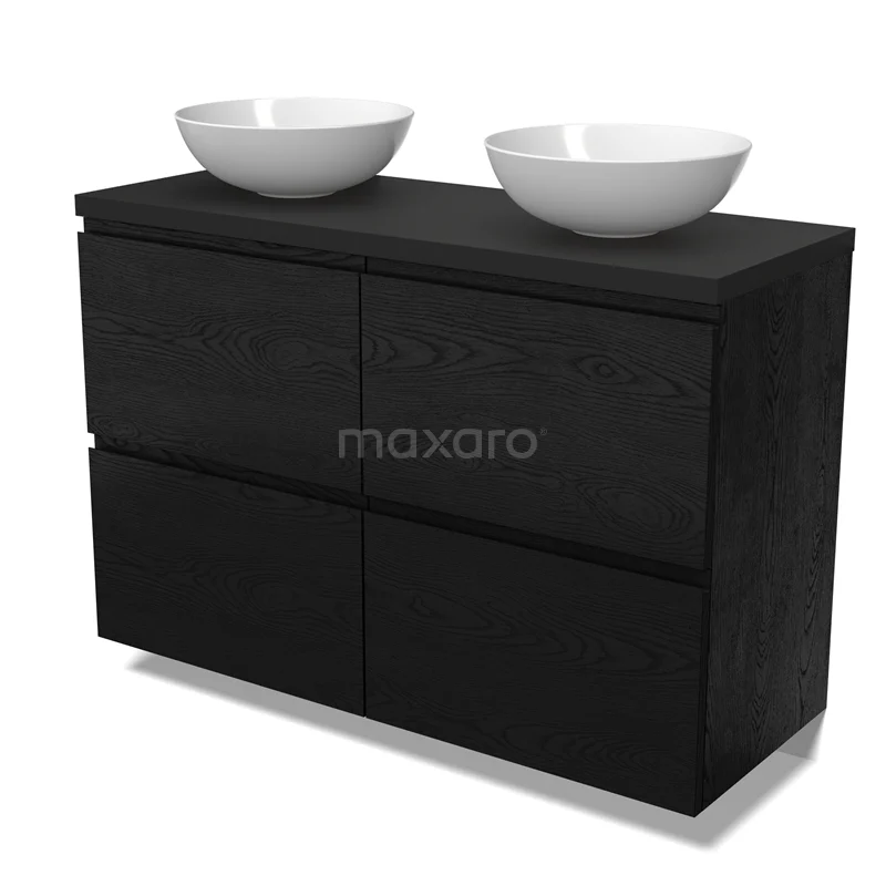Modulo Plato Badmöbel mit Aufsatzwaschbecken | 120 cm Schwarze Eiche Grifflos front Matt Schwarz blatt 4 hohe Schubladen