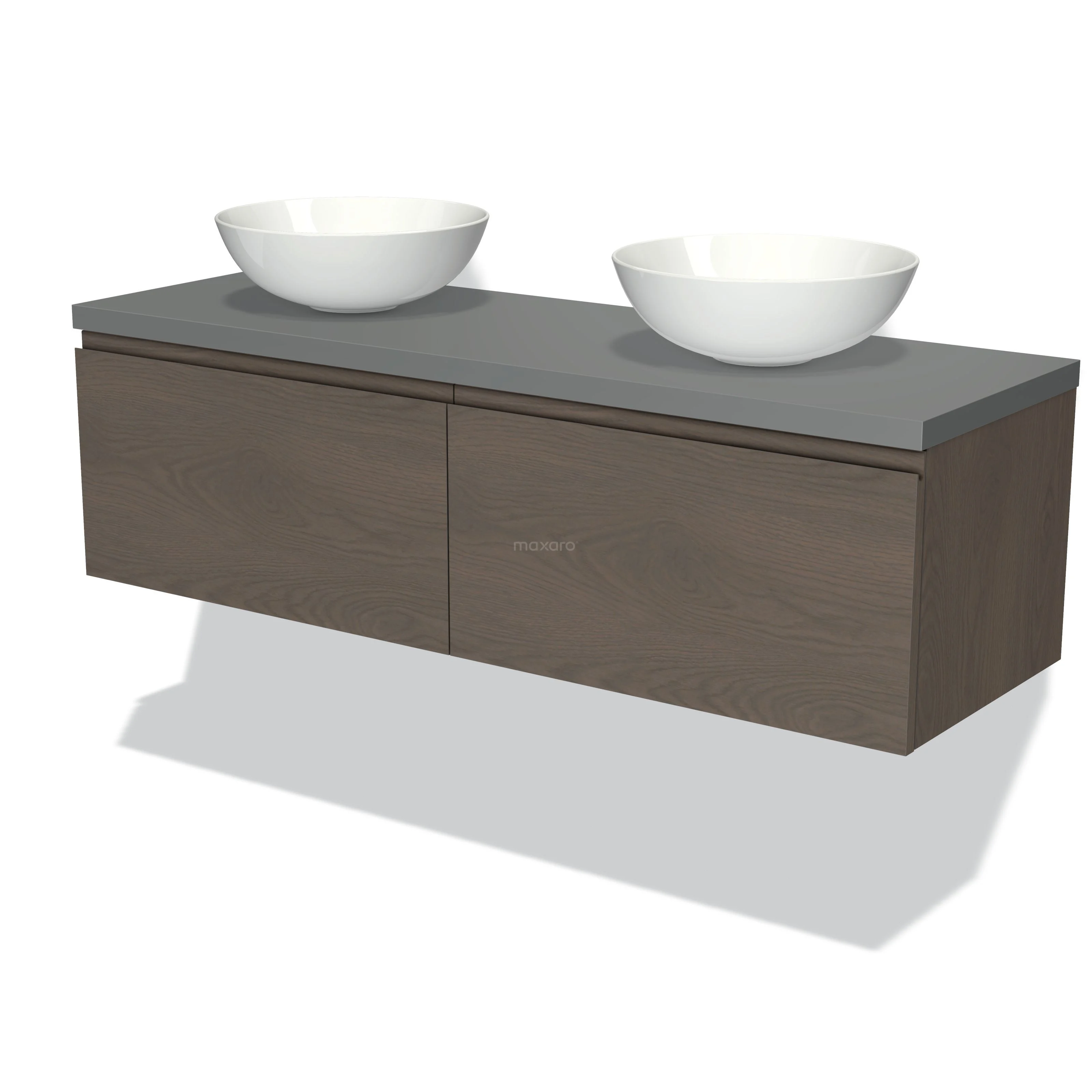 Modulo Plato Badmöbel mit Aufsatzwaschbecken | 140 cm Dunkelbraune Eiche Grifflos front Mittelgrau blatt 2 nebeneinanderliegende Schubladen