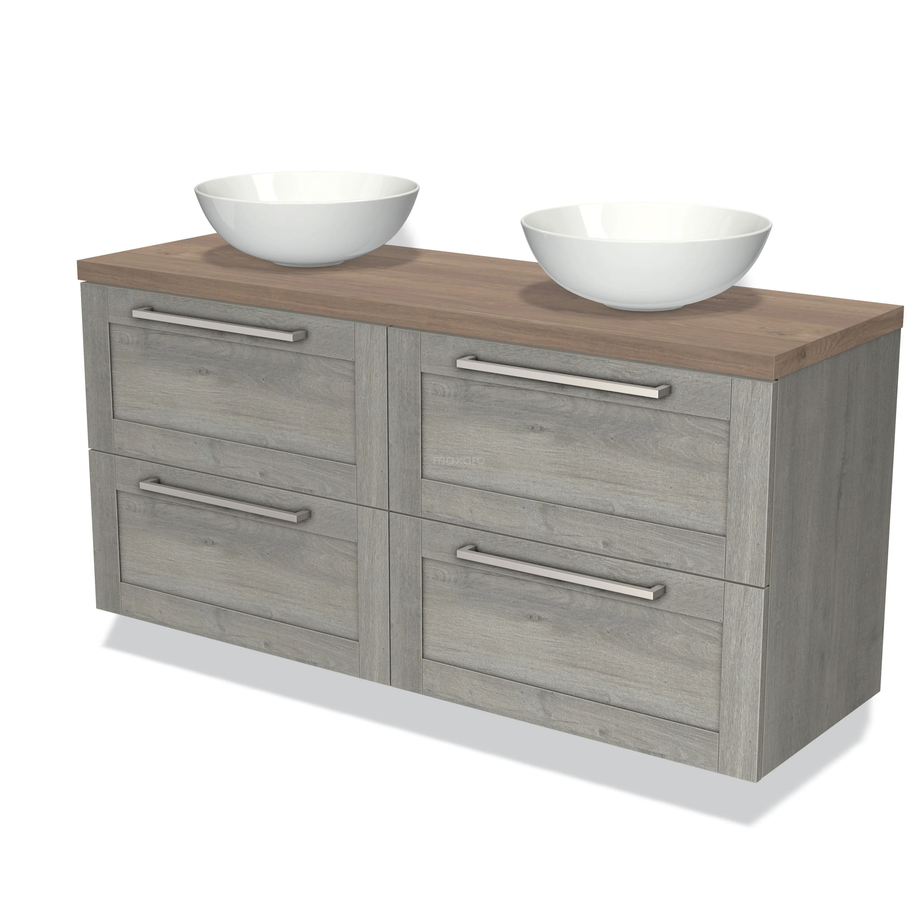 Modulo Plato Badmöbel mit Aufsatzwaschbecken | 140 cm Graue Eiche Rahmen front Mittelbraune Eiche blatt 4 Schubladen